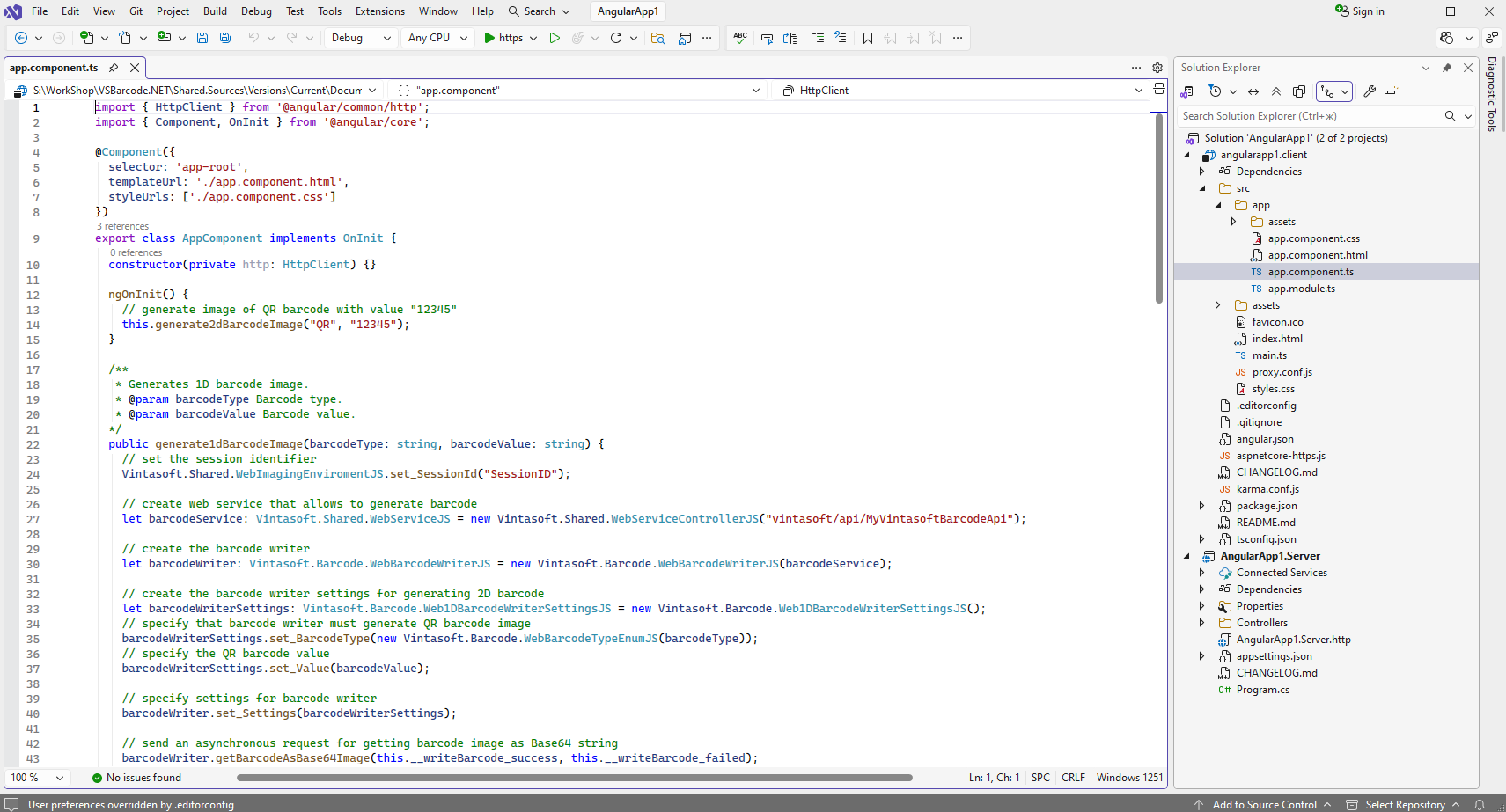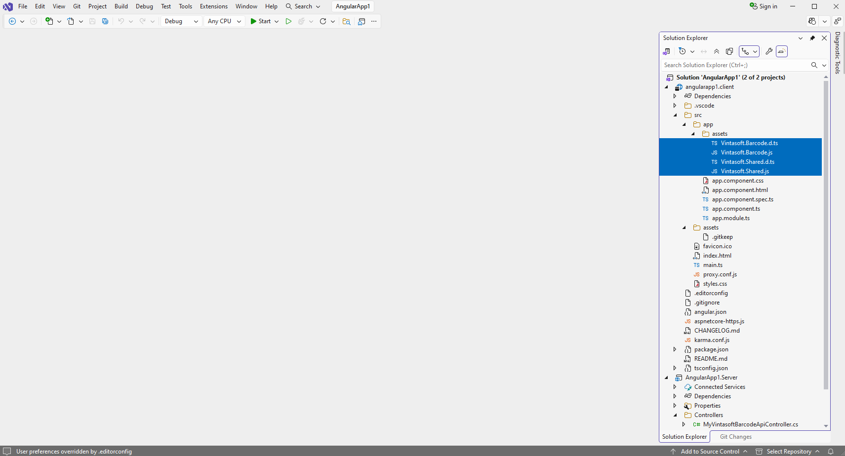 Copy Vintasoft.Shared.js, Vintasoft.Shared.d.ts, Vintasoft.Barcode.js and Vintasoft.Barcode.d.ts files from "<InstallPath>\VintaSoft Barcode .NET 15.3\Bin\JavaScript\" folder to the "src\app\assets\" folder in "angularapp1.client" project.