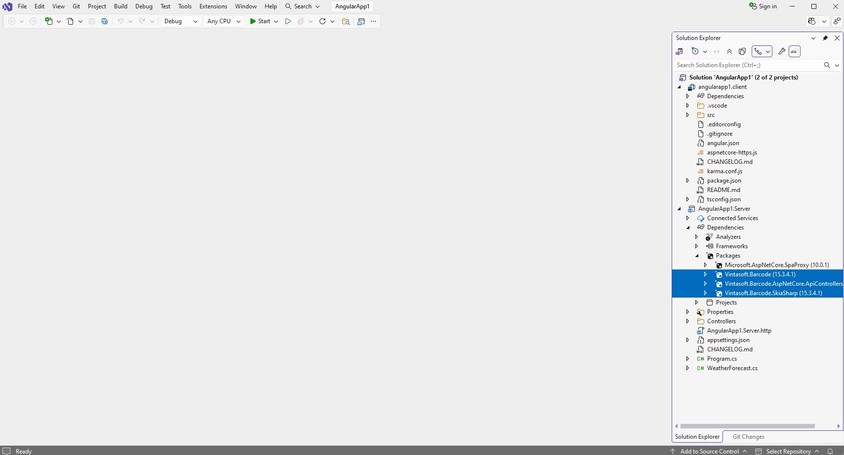 Add references to the nuget-packages "Vintasoft.Barcode", "Vintasoft.Barcode.SkiaSharp" and "Vintasoft.Barcode.AspNetCore.ApiControllers" to the "AngularApp1.Server" project.