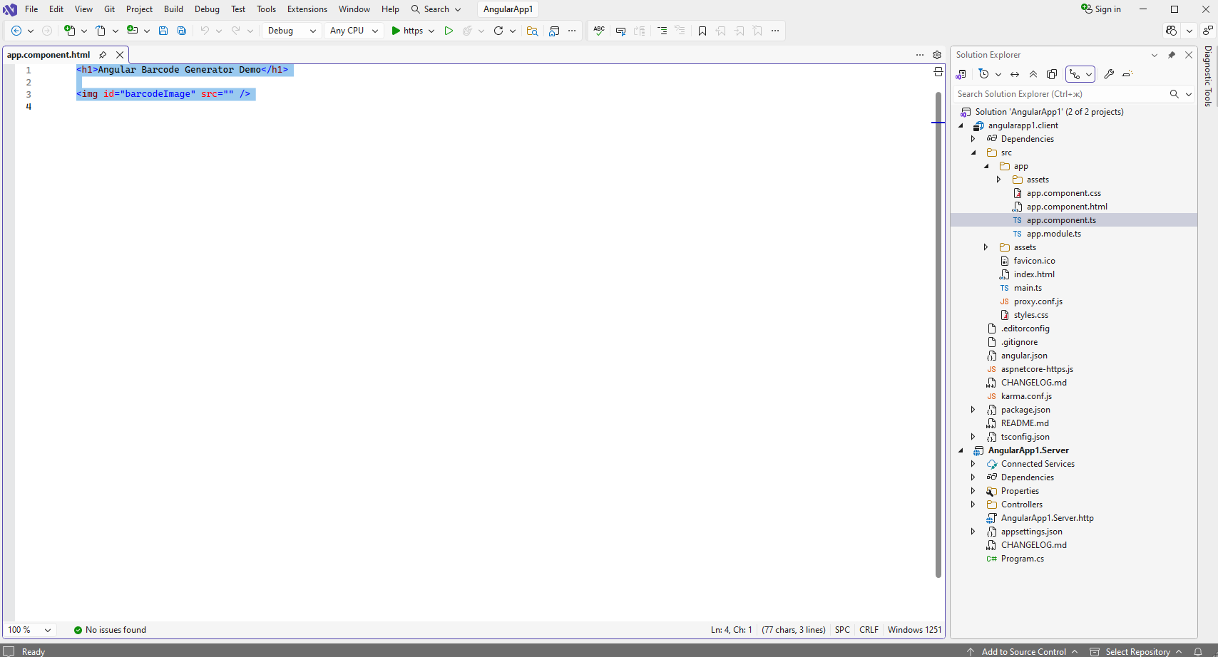 Open "src\app\app.component.ts" file in "angularapp1.client" project, clear the file, add TypeScript code to the "app.component.ts" file: