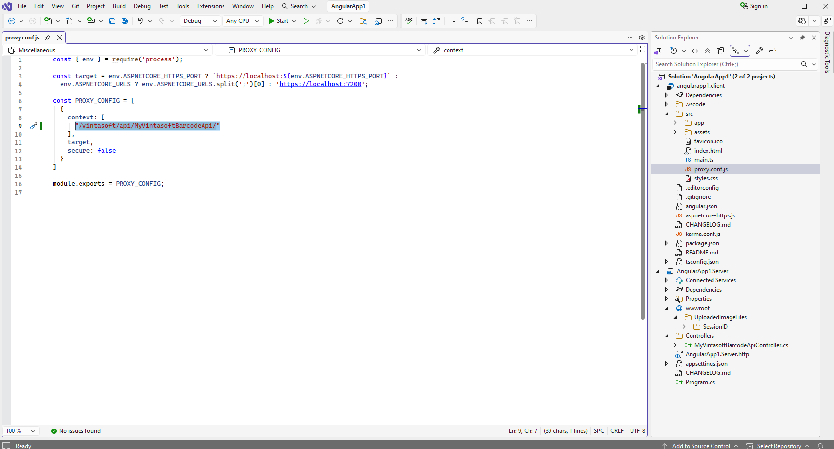 Open "src\proxy.conf.js" file in "angularapp1.client" project and specify that Angular aplication can have access to the ASP.NET Core Web API controller "/vintasoft/api/MyVintasoftBarcodeApi/" in "AngularApp1.Server" project: