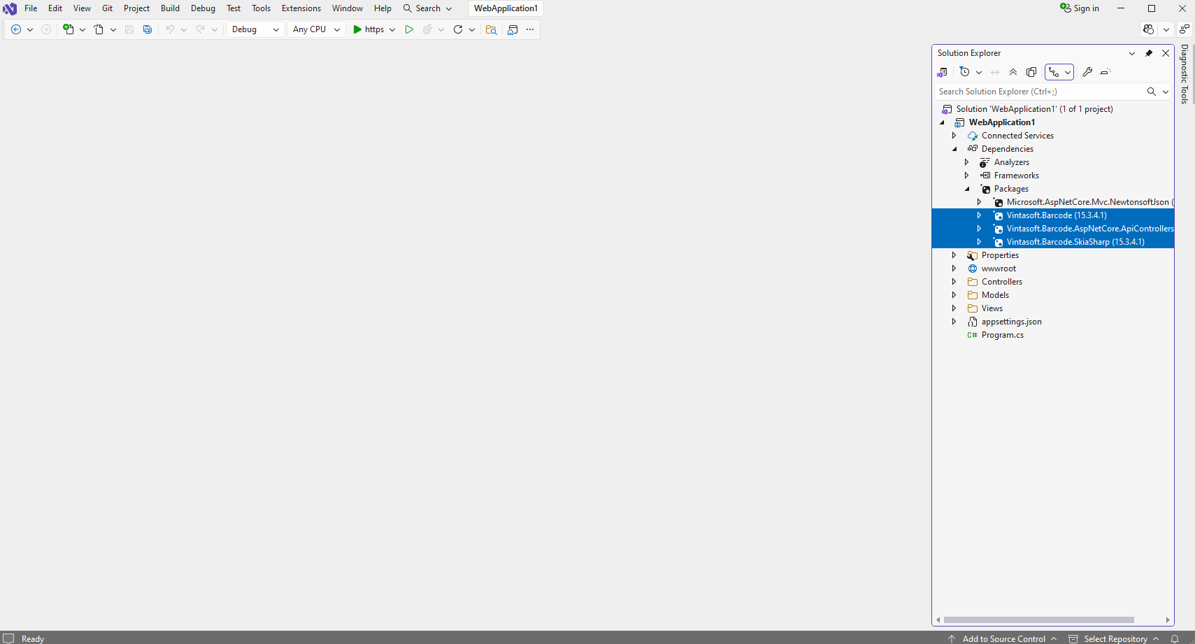 Add references to the nuget-packages "Vintasoft.Barcode", "Vintasoft.Barcode.SkiaSharp" and "Vintasoft.Barcode.AspNetCore.ApiControllers" to the ASP.NET Core project.