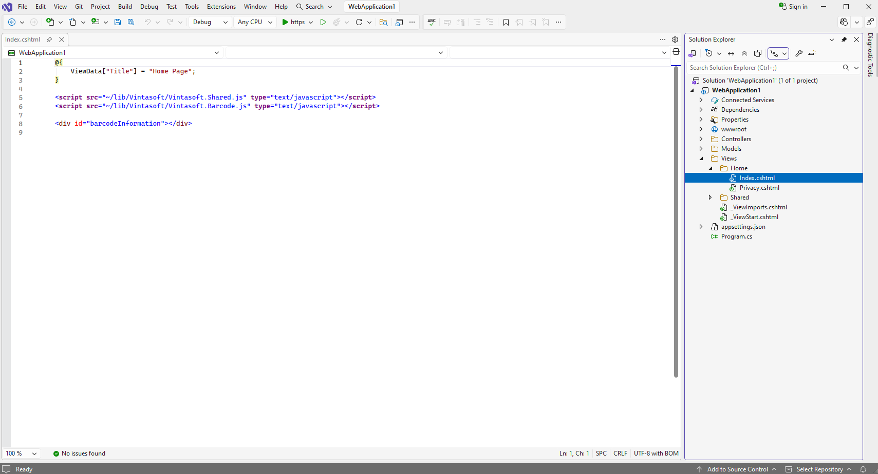 Open file "Views\Home\Index.cshtml", clear the file, add HTML code (references to VintaSoft JavaScript files; DIV-element that will display information about recognized barcodes) to the "Index.cshtml" file: