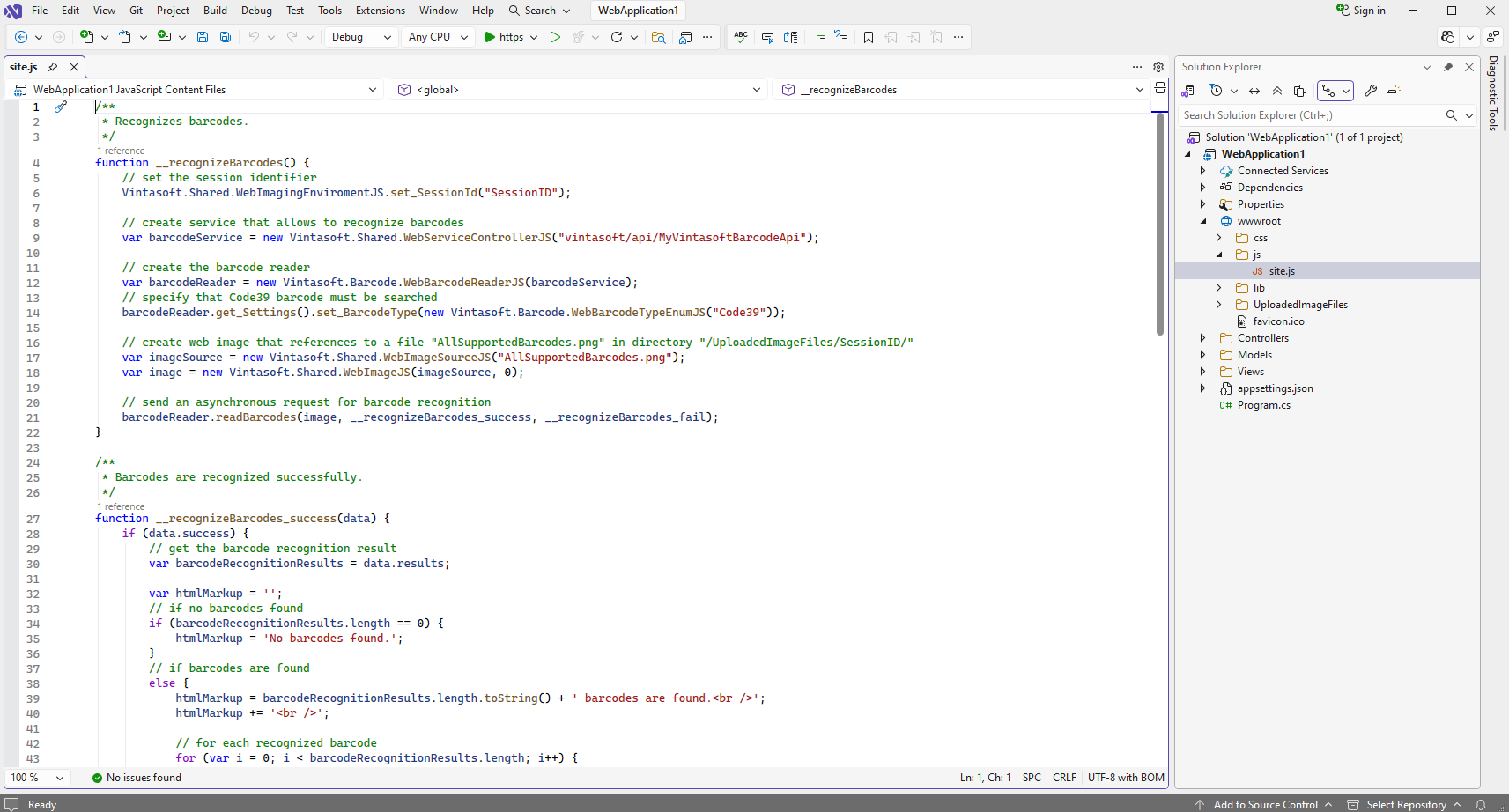 Open file "wwwroot\js\site.js", clear the file, add JavaScript code (recognizes barcode in image and displays barcode recognition result) to the "site.js" file: