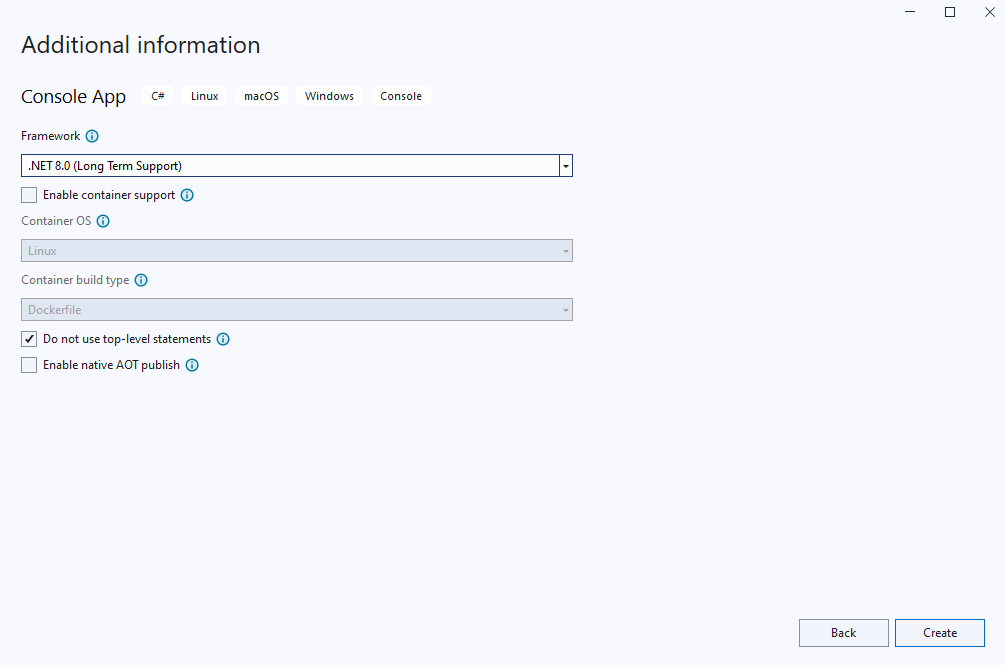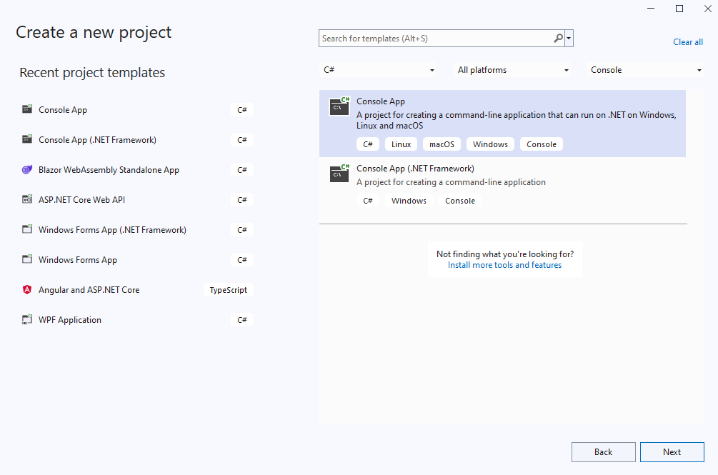 Open Visual Studio .NET 2022 and create a new project, of "Console application" type: