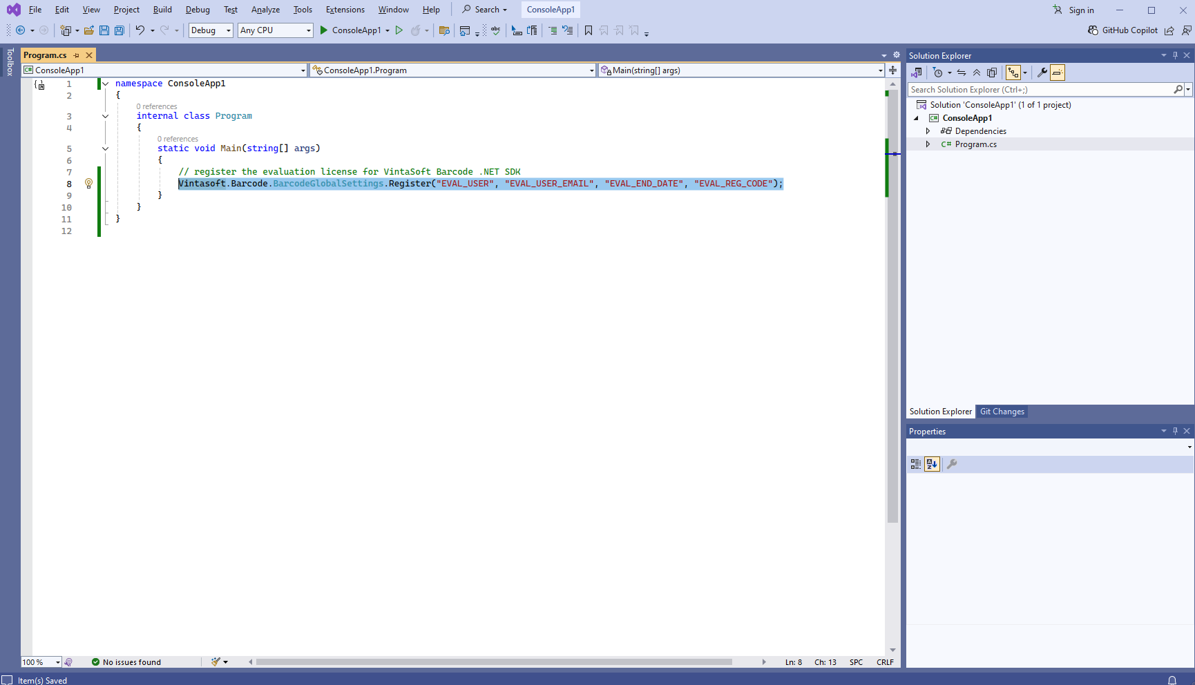 Get C# code for using evaluation version in Windows using the way described in documentation and insert the obtained code in the Main method of "Program.cs" file.