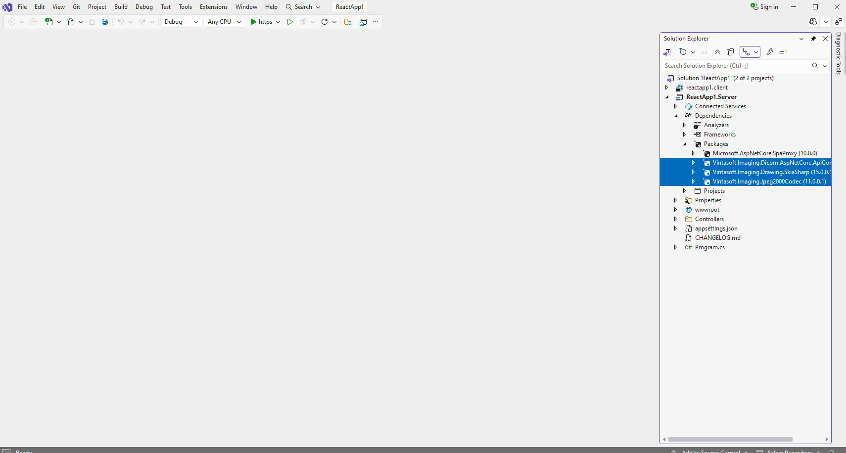 Add references to the nuget-packages "Vintasoft.Imaging.Dicom.AspNetCore.ApiControllers" and "Vintasoft.Imaging.Jpeg2000Codec" to the "ReactApp1.Server" project. Other necessary nuget-packages will be added automatically.