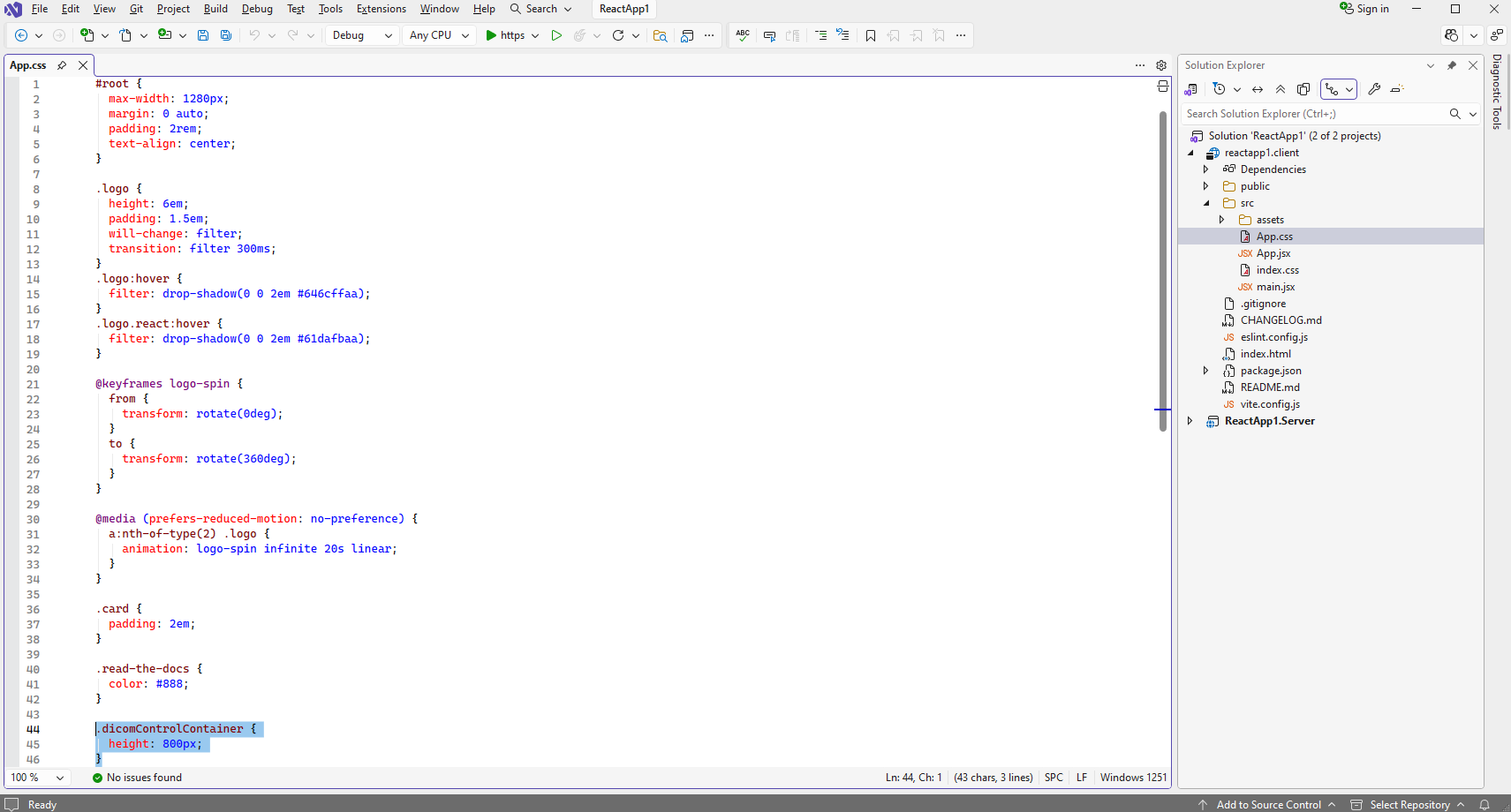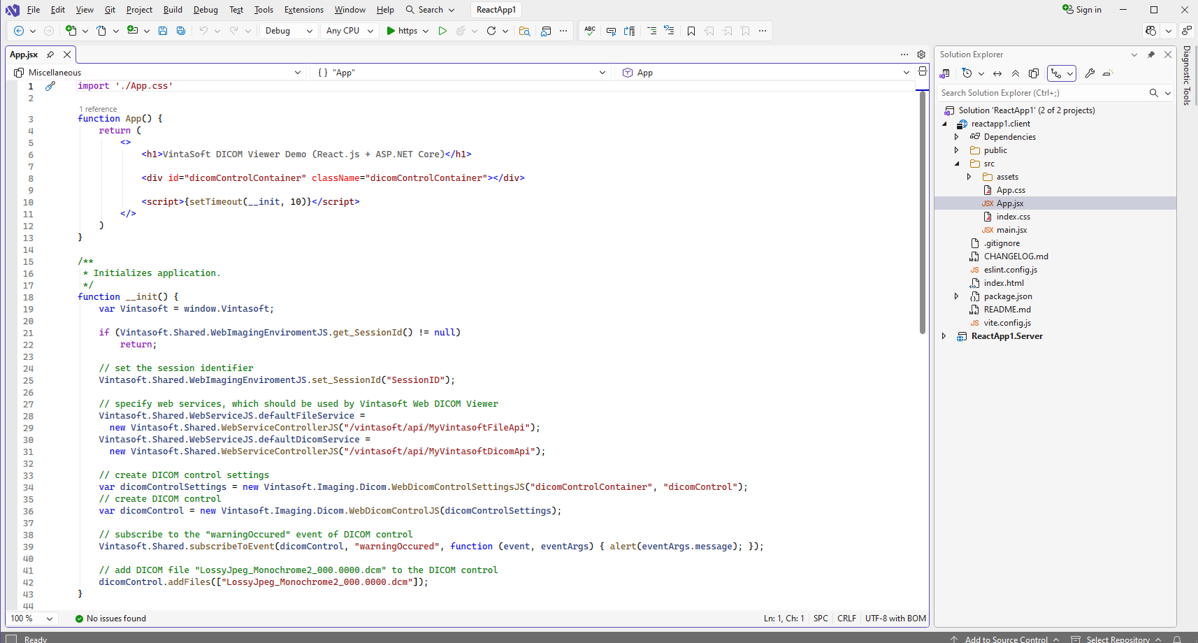 Open "src\App.jsx" file in "reactapp1.client" project, clear the file, code of "App" and "__init" functions. "App" function returns HTML markup (page header and DIV-element for DICOM viewer). "__init" function initializes the application and creates web DICOM viewer.