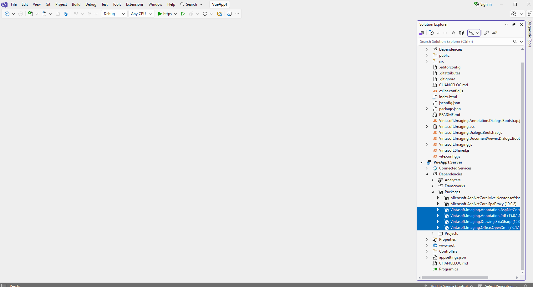 "VueApp1.Server" project: Add references to the Vintasoft nuget-packages to "VueApp1.Server" project.