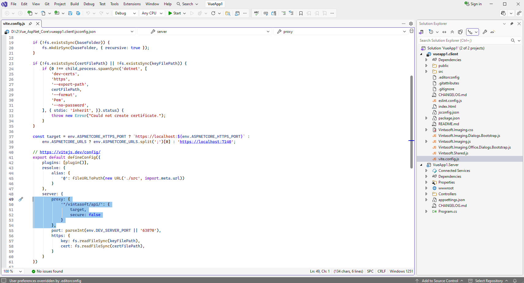Open "vite.config.js" file in "vueapp1.client" project and specify that Vue.js aplication can have access to the ASP.NET Core Web API controller "/vintasoft/api/" in "VueApp1.Server" project: