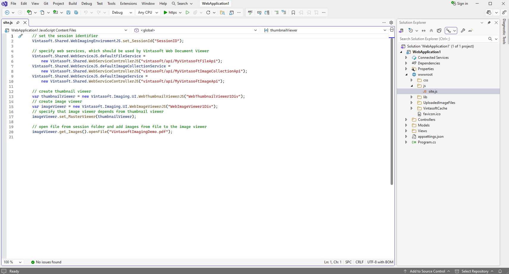 Open file "wwwroot\js\site.js", add JavaScript code that initializes and creates web image viewer: