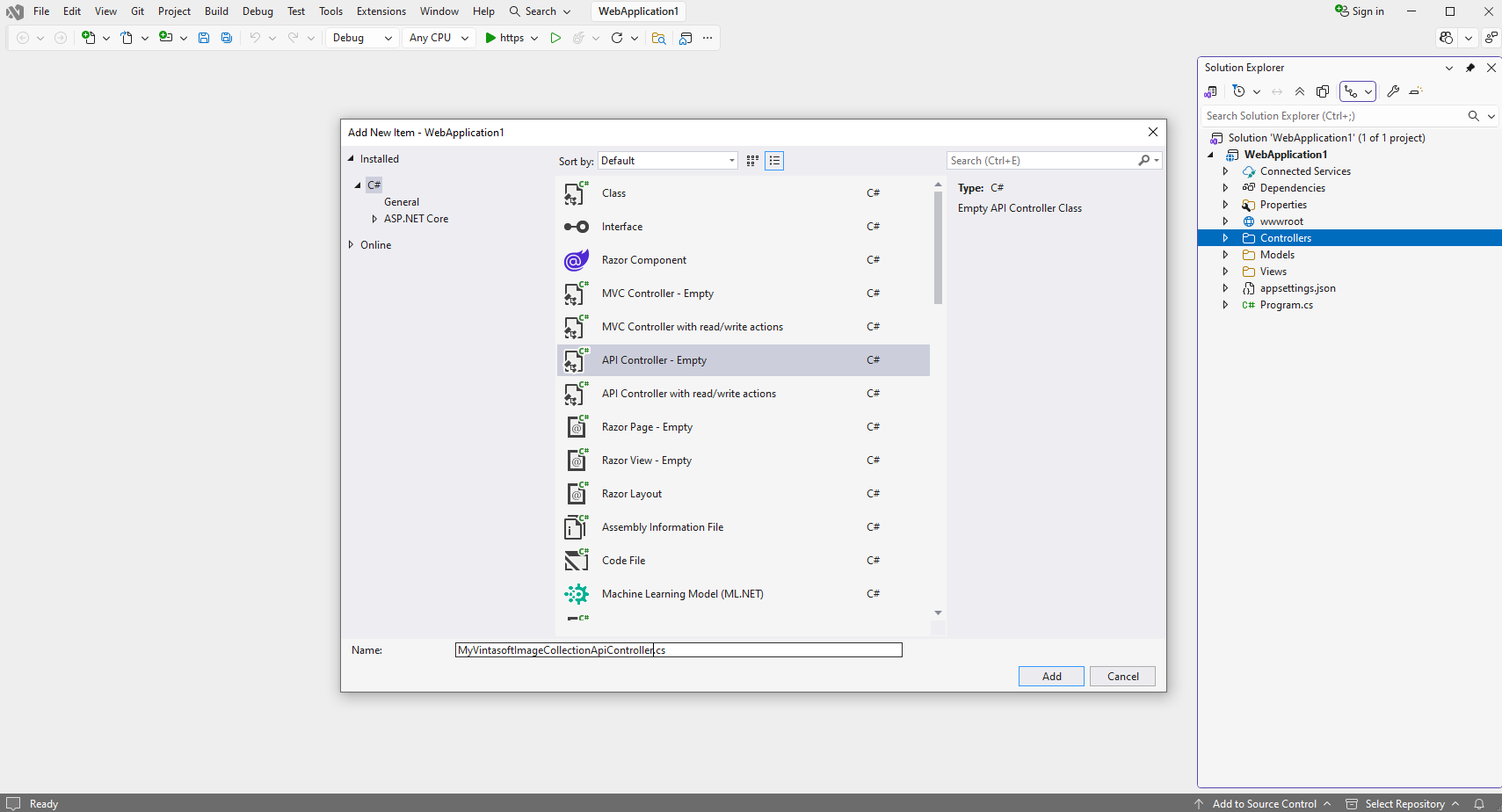 Select "API Controller - Empty" template, press the "Add" button, set the controller name to the "MyVintasoftImageCollectionApiController" and press the "Add" button