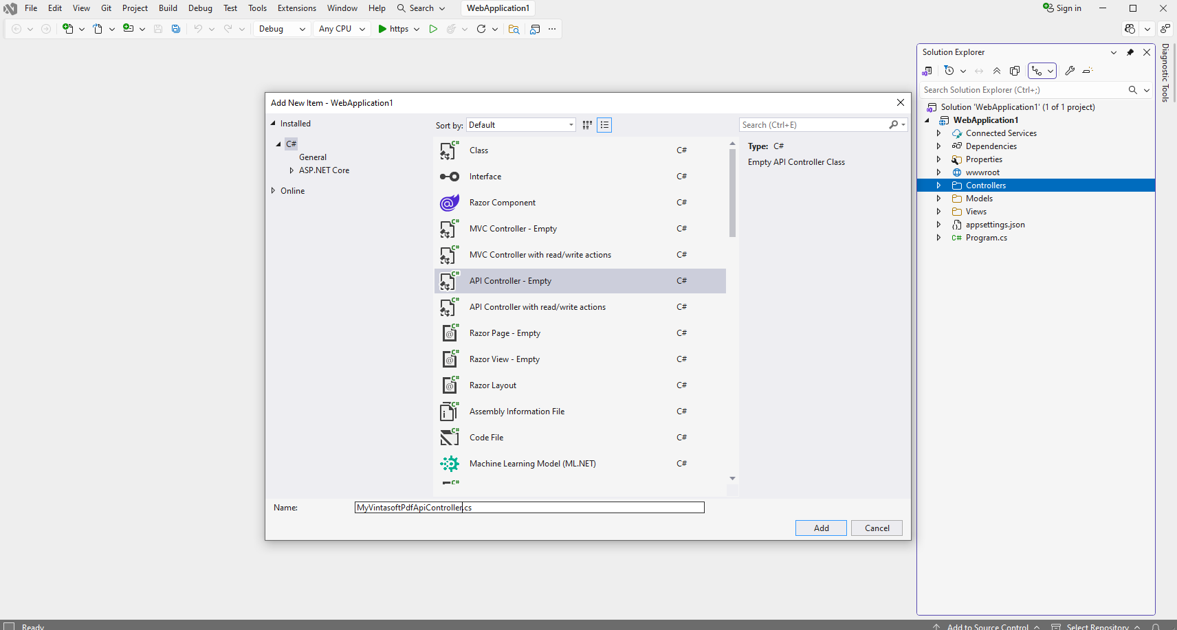 Select "API Controller - Empty" template, press the "Add" button, set the controller name to the "MyVintasoftPdfApiController" and press the "Add" button