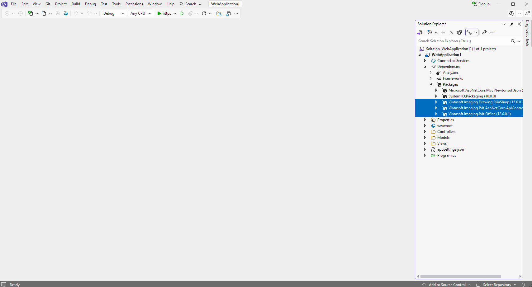 Add references to the nuget-packages "Vintasoft.Imaging.Drawing.SkiaSharp", "Vintasoft.Imaging.Pdf.AspNetCore.ApiControllers" and "Vintasoft.Imaging.Pdf.Office" to the ASP.NET Core application. Other necessary nuget-packages will be added automatically.