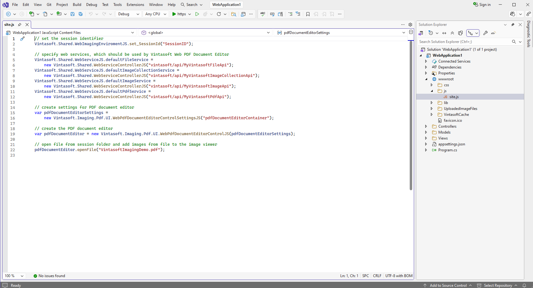 Open file "wwwroot\js\site.js", add JavaScript code that initializes and creates web PDF document editor: