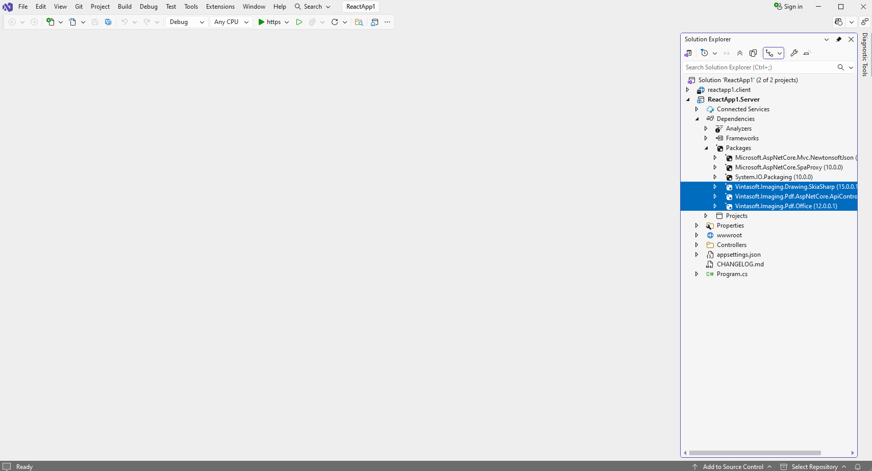 "ReactApp1.Server" project: Add references to the Vintasoft nuget-packages to "ReactApp1.Server" project.