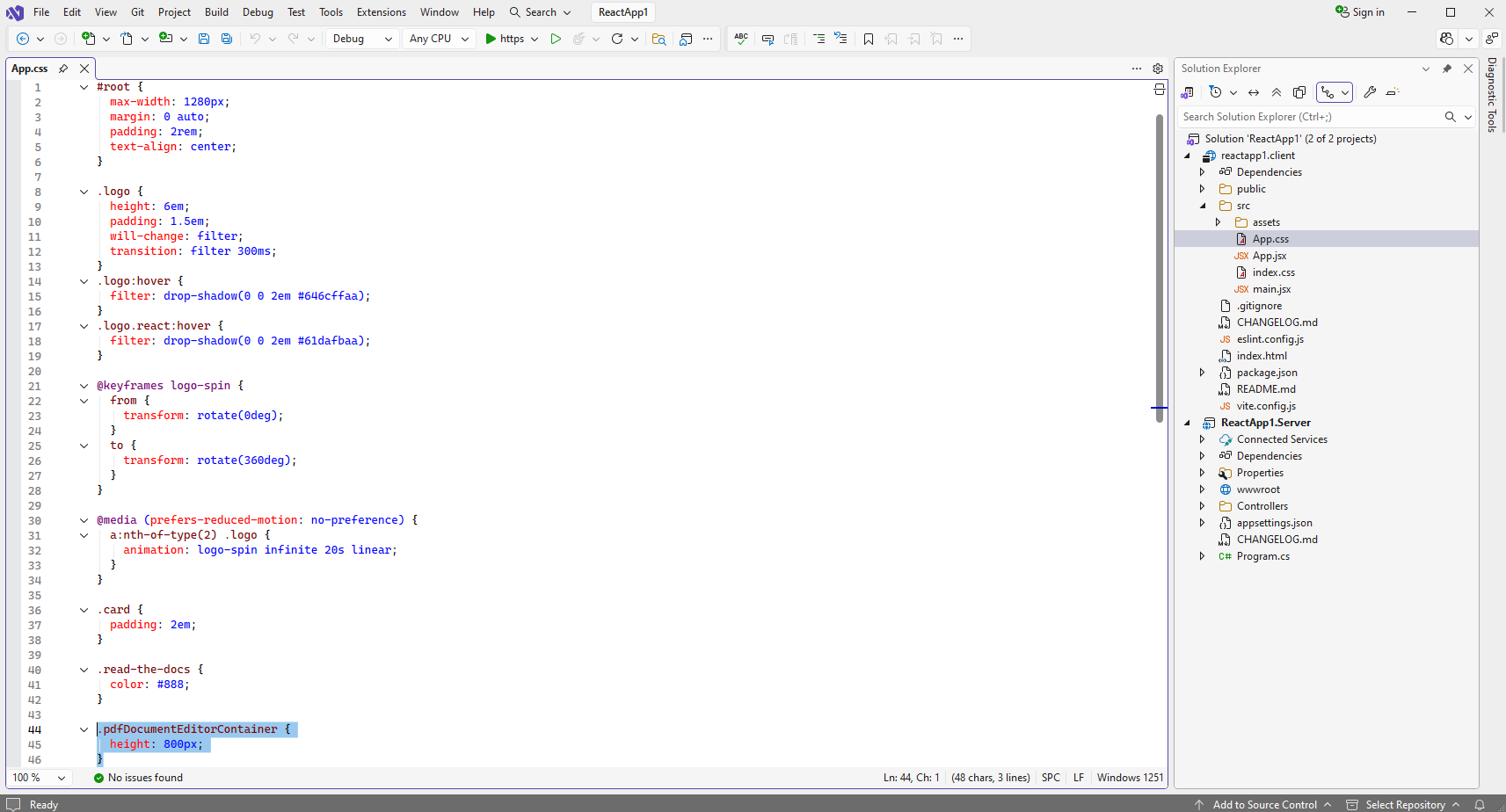 Open "src\App.jsx" file in "reactapp1.client" project, clear the file, add code of "App" and "__init" functions. "App" function returns HTML markup (page header and DIV-element for web PDF document editor). "__init" function initializes the application and creates web PDF document editor.