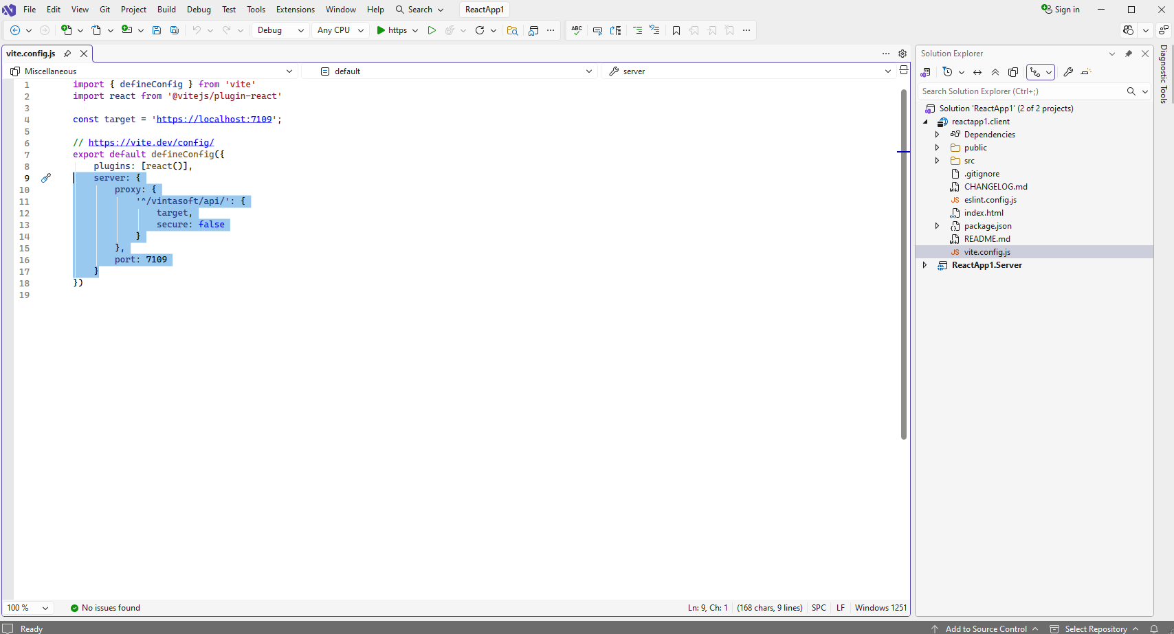 Open "vite.config.js" file in "reactapp1.client" project and specify that React.js aplication can have access to the ASP.NET Core Web API controller "/vintasoft/api/" in "ReactApp1.Server" project: