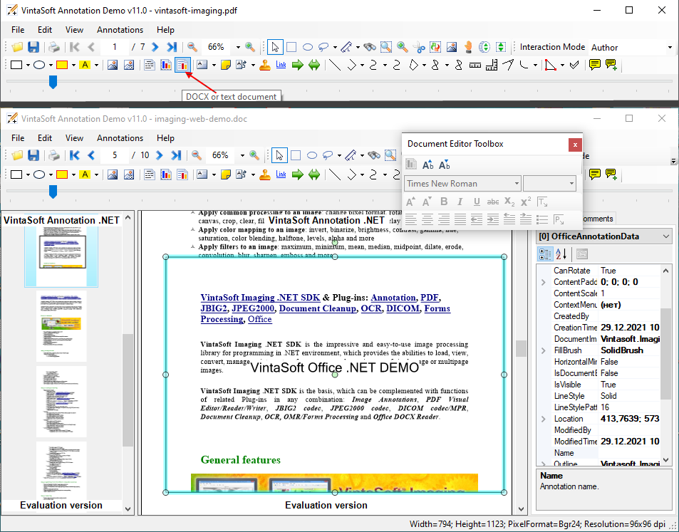 以下是 VintaSoft 注释演示的屏幕截图,演示了如何向图像添加显示 DOCX 页面的 Office 注释: