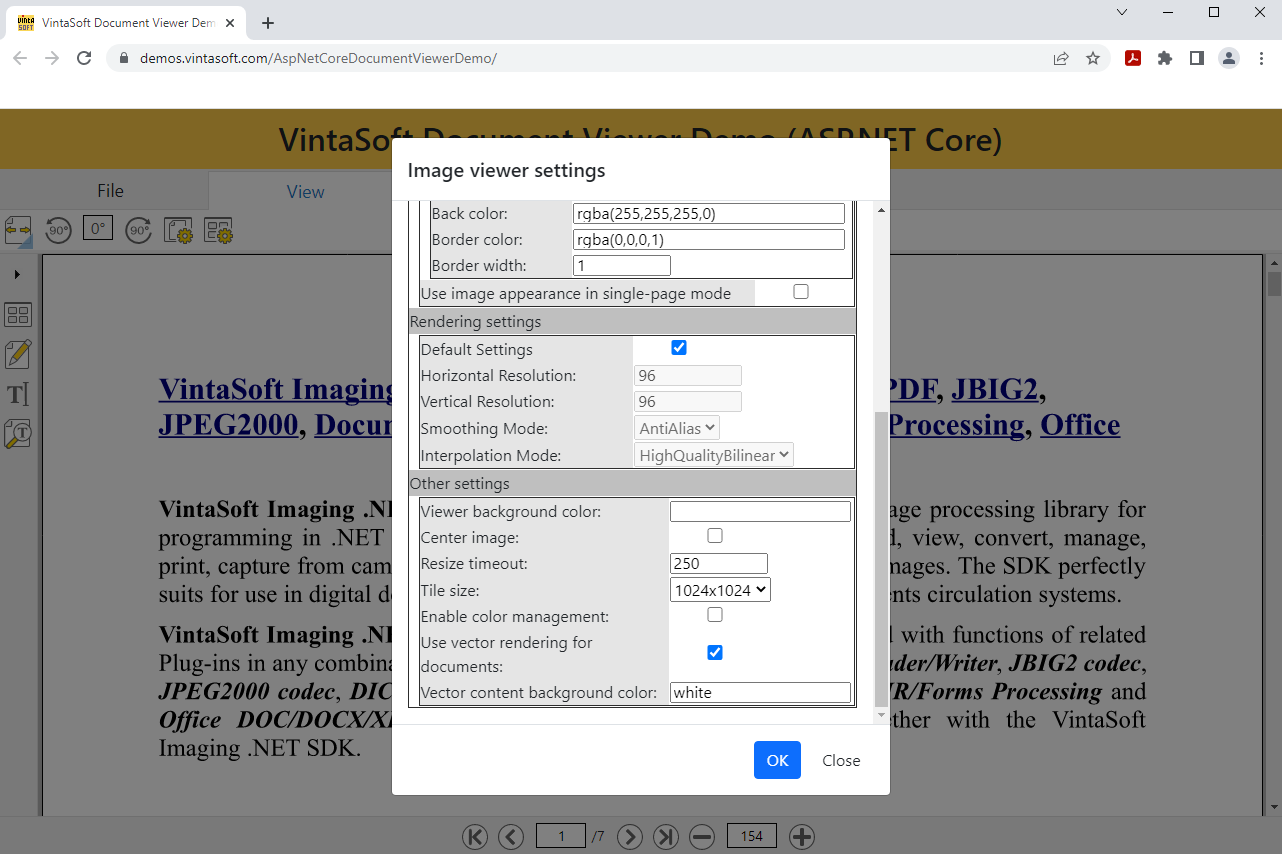 以下是 VintaSoft Web Document Viewer Demo 的屏幕截图,其中显示了启用矢量渲染的 Web 图像查看器的设置: